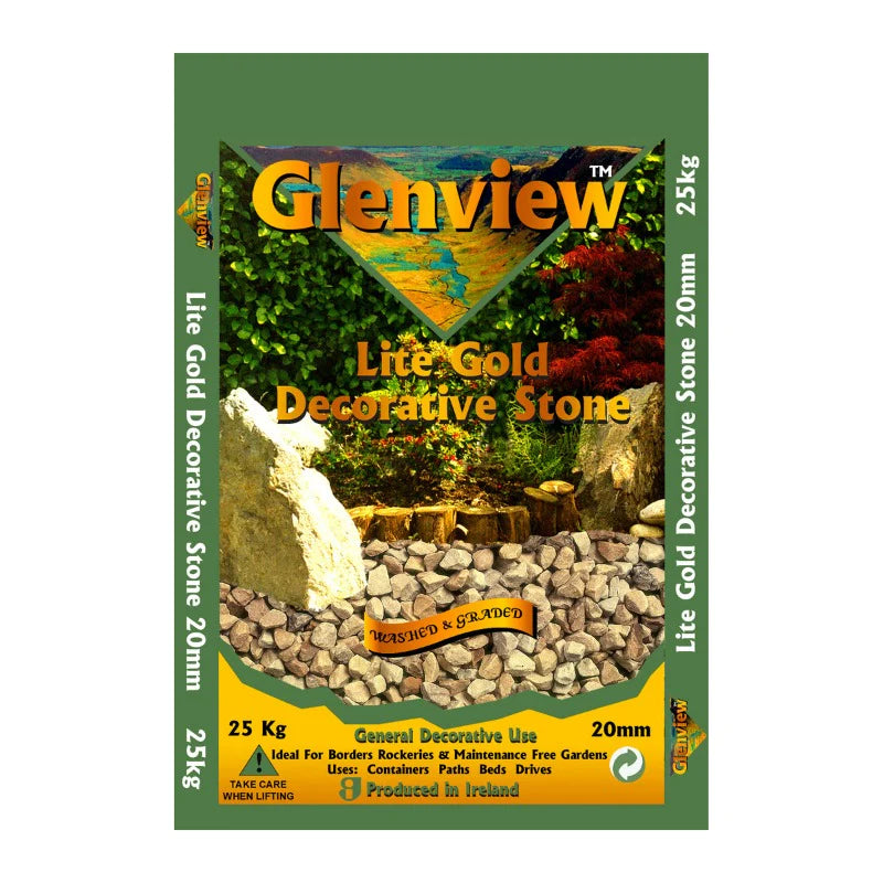 Glenview Lite Gold 20mm pale gold gravel 25kg bag, decorative garden stone, Keans Claremorris local delivery