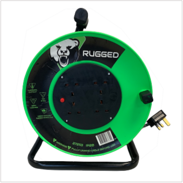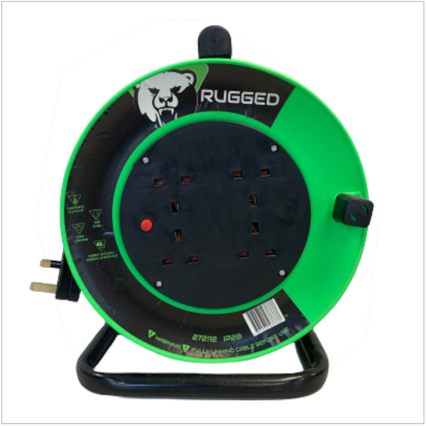 25m 13A 4 socket cable reel with 1.25mm cable, green moulding, 480W unwound, 1600W wound - Keans Claremorris