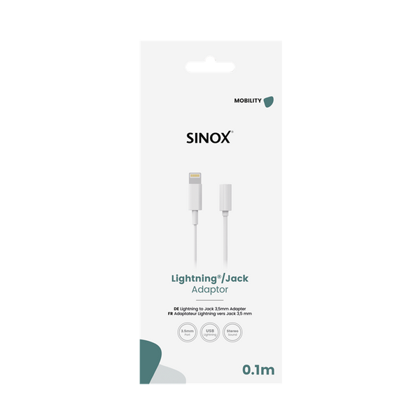 Sinox SX Lightning to 3.5mm headphone adapter white for iPhone and iPad, eco-friendly packaging - Keans Claremorris
