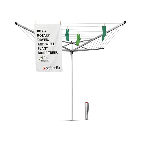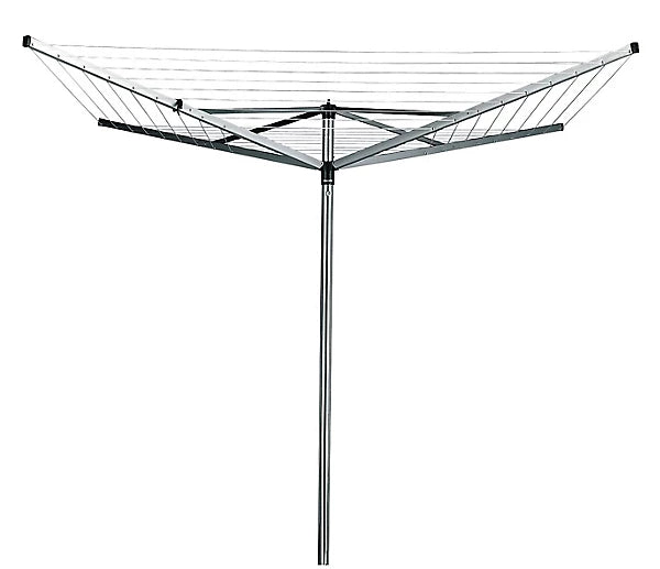 Maximize your laundry space with the Brabantia Compact Rotary Clothes Line, designed for small gardens but big drying needs. Its clever umbrella-style design unfolds easily, offering 40 meters of UV-resistant, non-slip drying line spread across four sturdy arms. Featuring a robust 35mm ground-level plastic tube with a cap for secure anchorage, this clothesline stays stable even in windy weather.