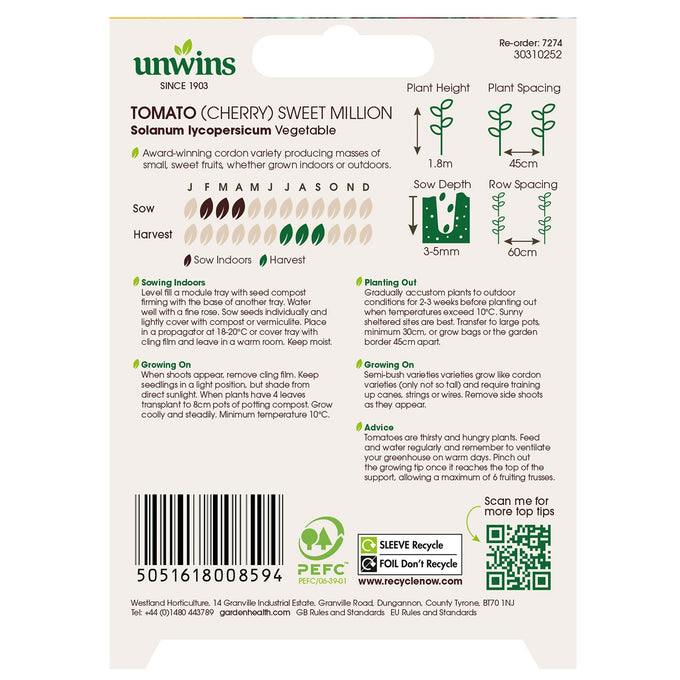 Unwins Cherry Tomato Sweet Million Seeds will give you deliciously sweet cherry fruits. This award-winning cordon variety produces masses of small, sweet fruits, whether grown indoors or outdoors.