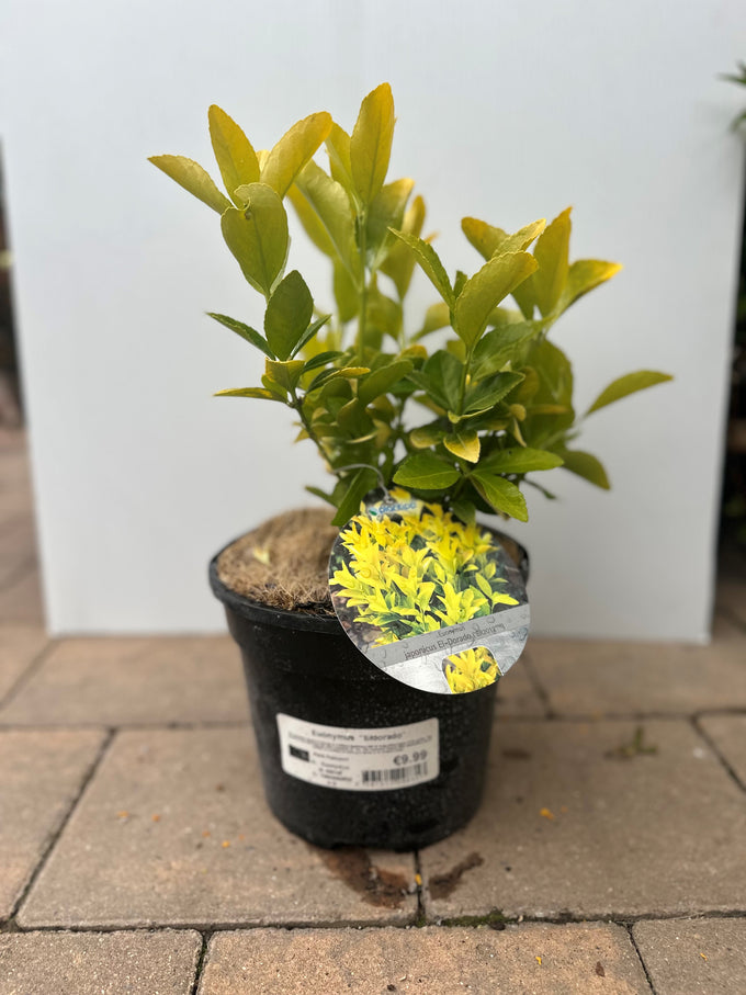 This is a very upright tree for any garden; Euonymus japonicus El Dorado is an evergreen tree with a columnar habit. The oval leaves emerge bright yellow, becoming bright green with age or if the situation is too shady. The flowers are insignificant. Good in architectural or city and courtyard gardens or a low-maintenance garden, and corners of beds and borders as a small punctuation mark. If grown in full sun, reliably moist soil will be needed. Japanese spindle El Dorado is an easy tree that needs minimal pruning (occasionally trim off wayward twigs) and it can also be grown as a low hedge in a sunny spot, and is good on banks and slopes.
