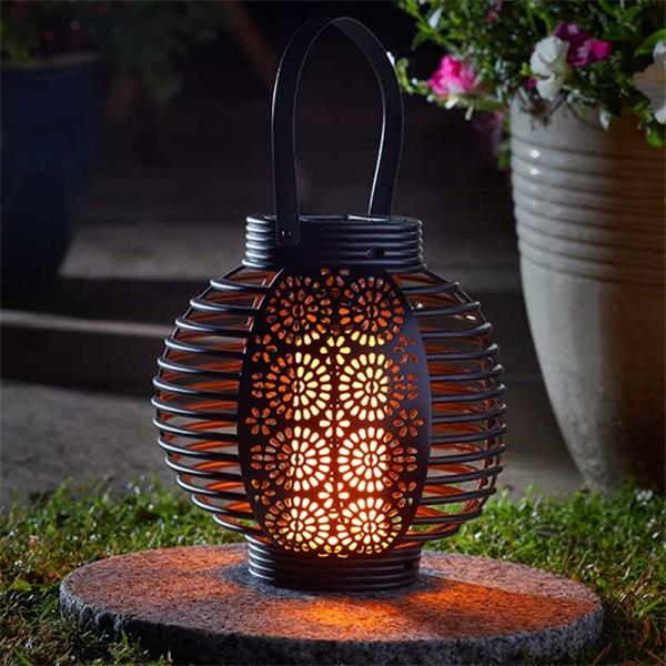 The Ferrara Flaming Solar Lantern is a silhouette sphere which creates a beautiful flame effect on table tops or patios. This lantern is made of black impact resistant plastic and features a handle for hanging or carrying the lantern. The internal LED's are powered by a replaceable 30mAh AA rechargeable battery which is charged by a solar panel fitted in to the top. When fully charged this fascinating light will run for more than 6 hours and features a day light sensor to switch the LED on at dusk. Unlike other lanterns this feature has a flickering warm orangey / yellow led which imitates a flame