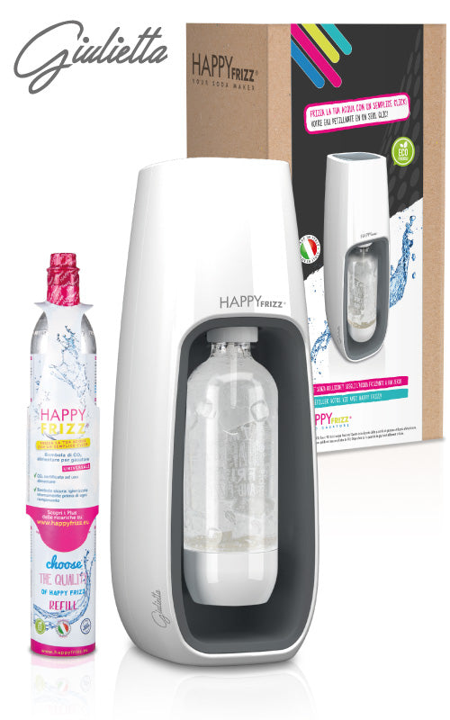 Giulietta is very simple to use thanks to the tilting bottle lock, which, with its invitation, supports you in inserting the bottle and the button, made extremely performing by our industrial technicians; with a touch the valve is triggered and your water fills with bubbles immediately. Like the other carbonators of the Italian brand Happy Frizz, you have the possibility to choose the desired carbonation level at the touch of a button. One pressure for slightly sparkling, two for medium, three for very sparkling, four for very sparkling and so on.