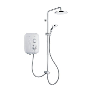 Experience true exhilaration with the stunning elite Se silent dual, only available from Mira showers. The beautiful deluge shower head gives you even more. Enjoy the silent performance of this dual outlet electric shower and never look back! All with the simple turn of a coin! No need for call outs with the clever Mira clean-flo self service filter designed for low pressure, gravity fed systems. Enjoy excellent water pressures with the integrated pump. Simply divert between the beautiful 200mm deluge head and 90mm multi spray handset - available in white and chrome finish. Select and forget controls.