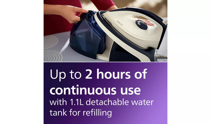 This steam generator makes your ironing experience faster, thanks to extra powerful continuous steam. Comfortable ironing, Automatic shut-off when the iron is left unattended. A 1.1L detachable water tank makes it easy to use and store.