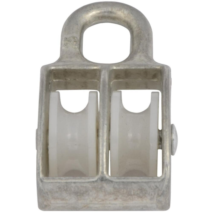 25mm double hoist pulley made from steel with a zinc-plated body and white polyethylene pulley. Features an integrated eyelet in the body, ideal for ropes up to 7mm.