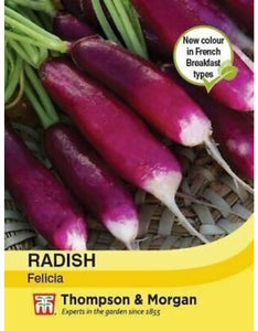 An exciting new vivid purple skinned variety, Radish ‘Felicia’ has a good peppery punch, a crisp texture and looks fabulous in a salad or finely sliced as a garnish to a fancy dish. It's long French Breakfast shape makes it easier to slice than round radishes or simply for munching as a snack. Enjoy fresh harvests from late spring all the way through to autumn by sowing at intervals from April to September. Height: 15cm (6”). Spread: 10cm (4”).