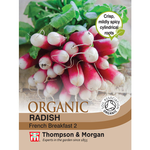 This popular old variety has stood the test of time. It's crisp, crunchy, cylindrical roots have a strong, clean flavour that spice up your summer salads. Radish 'French Breakfast 2', produces reliable crops of attractive red skinned roots with bright white tips. An ideal crop for containers, window boxes and greenhouse borders. Sow regularly for continuous succulent roots throughout the summer. Height: 15cm (6"). Spread: 10cm (4").