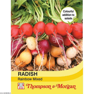 hand selected this visually stunning array of coloured skinned radishes all with crisp, white, delicious flesh. Radish Rainbow Mixed have round to plum shaped roots with white, purple, red, white and red, or a stunning gold skin, to add colour to your summer salads or sandwiches.