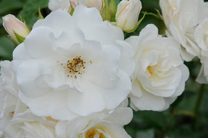 Sometimes listed as ‘Korbin’, Rosa ‘Iceberg’ is a fantastic and popular white floribunda rose. Its medium-sized, white blooms, emerge from shapely pink-tinted buds, throughout summer. It makes a fine hedge, but looks best as a specimen shrub in a mixed or shrub border. Its open, single flowers make it a good choice for a wildlife garden.