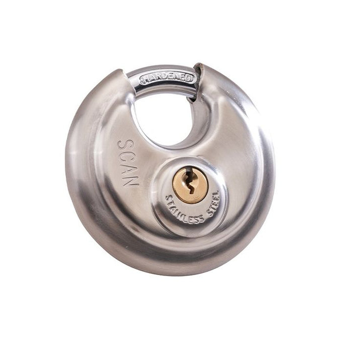 The Scan 70mm Disc Padlock is suitable for indoor and outdoor use, the higher security Scan disk type padlock offers a weather-resistant, anti-corrosion stainless body and a hardened steel shackle - plus a 5 pin brass tumbler lock mechanism. Supplied complete with 3 keys.