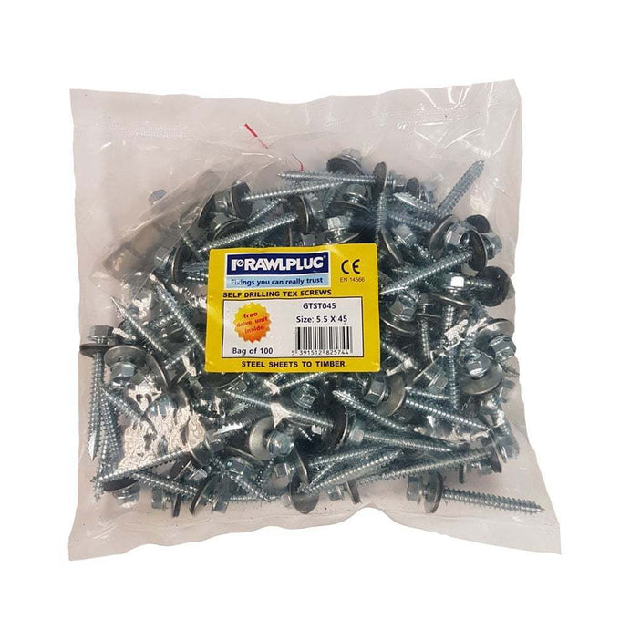 This pack of 100 self-tapping hex screws feature a Type 17 5.5 x 45mm design and 19mm outside diameter bonded washer. The screws have a zinc plating for superior corrosion resistance, making them ideal for outdoor use.