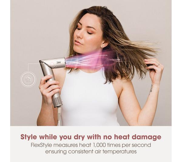 Weighing just 700 g, the Shark FlexStyle is designed for comfortable, fatigue-free styling. Its powerful 1400 W motor dries hair quickly, so you spend less time styling and more time showing off your look. Finish with the cool shot to lock in your style for all-day hold.
