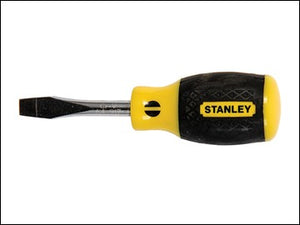 The Stanley Cushion Grip Flared Tipped screwdrivers have a chrome plated bar which is corrosion resistant, and magnetic tips for easy pick up and screw locator. The soft grip handle provides excellent torque and comfort. It has a smooth domed end for fast spinning action, speed and comfort, and the large diameter handle offers greater torque which is needed for driving wood screws. Screw tip identification is shown on the handle.