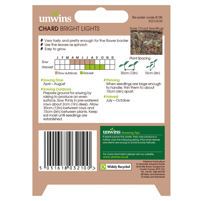Unwins Swiss Chard Bright Lights Seeds produce easy to grow swiss chard stems that are pretty enough for the flower border! With edible leaves and stems, this crop is great value, providing plenty to eat and enjoy!