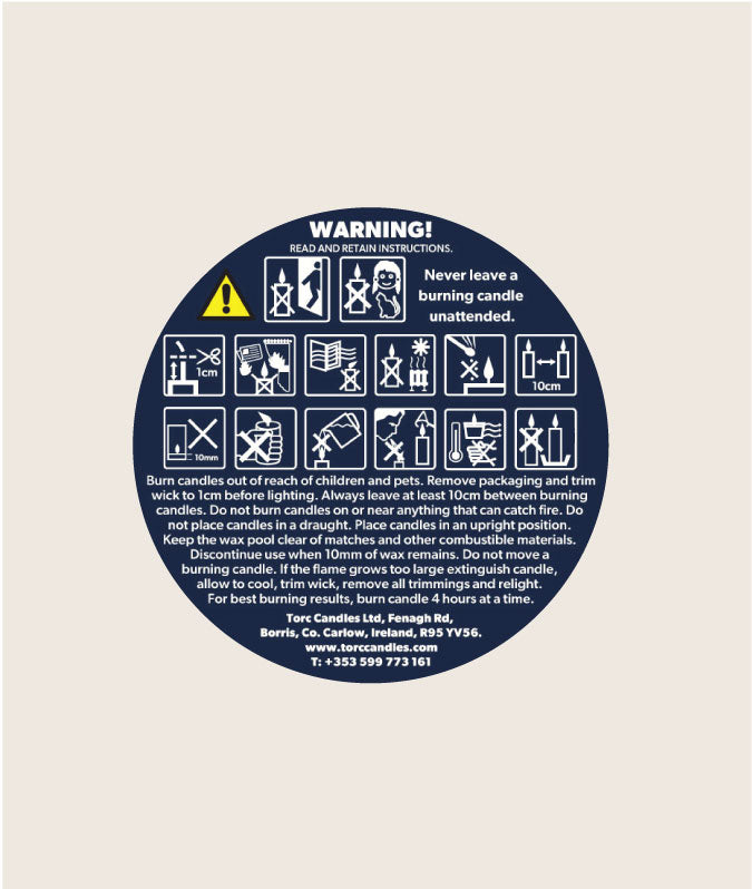 Keep out of reach of children, burn-in 4-hour intervals, trim the wick to 10mm, and keep upright on a heat-resistant surface. |
